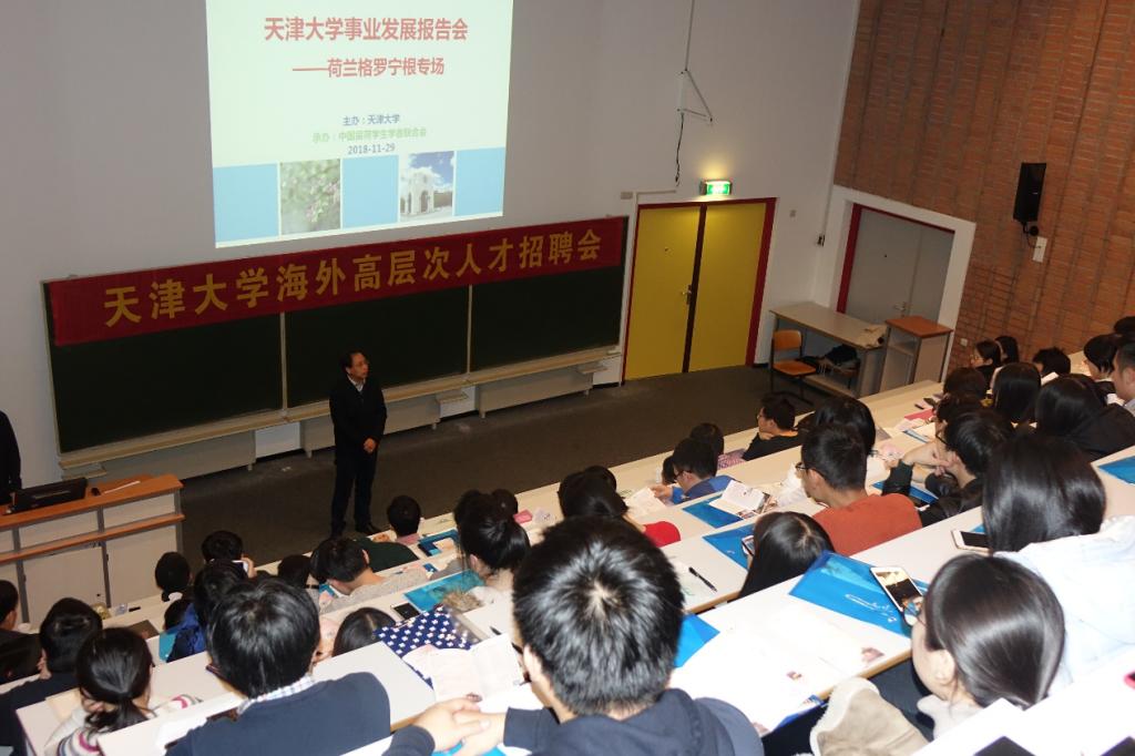本站讯 2018年11月29日,天津大学事业发展报告会在荷兰格罗宁根大学召开。天津大学代表团由副校长王树新、建筑学院副院长曾鹏、机械学院副院长焦魁、研究生院招生办公室主任孙鹤、人事处副处长栗大超及国际合作与交流处交流科科长魏有香等人组成。本次事业发展报告会由天津大学主办,中国留荷学生学者联合会承办。