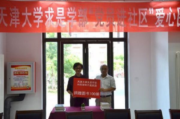 单小麟向与会人员介绍了求是学部以及学部党支部的整体情况,他在讲话中提到,天津大学求是学部2017级茅以升团支部作为“天津大学——津南区实践育人共同体”的试点之一,与双新街万盈社区党支部结对共建。现在此基础上,进行双方党支部共建活动。单小麟表示希望通过双方党支部共建、党员进社区等支部活动,进一步推进深化校地合作、贯彻落实习近平总书记在北京大学师生座谈会上谈到的“知行合一”,对社区居民、青年学生起到思想和政治的引领作用,从而提升党员的服务意识。让每一位学生党员在实践中感悟国情、社情、民情,培养学生的家国情怀和社会责任感,更好地为天津经济社会发展贡献力量。单小麟代表学部向社区居民代表杨春蓉捐赠由求是学部学生党员以及17级茅以升一班学生团支部所捐献的图书共计100册。