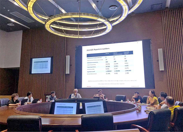 报告会后,在郑东图书馆多功能厅举行了科研报告编委讨论会,两位主编及工作人员与诸位专家学者针对Springer Nature开放获取期刊的影响力、评议流程、付费机制、版面涉及等问题进行了深入座谈交流。