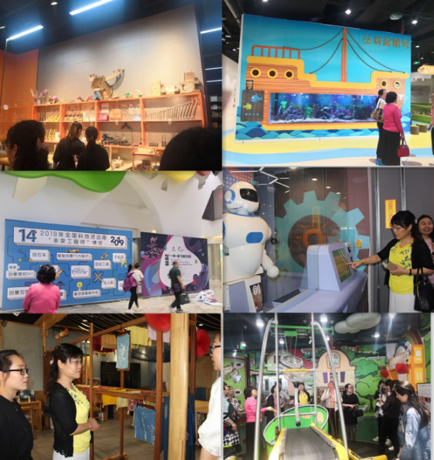 17日上午10点,成员们到达学访活动第一站中国宋庆龄青少年科技文化交流中心。在中国创客教育联盟副秘书长、中国机器人教育联盟副秘书长、北京寓乐世界教育科技有限公司副总裁李晓东的全程陪同下,参观体验了交流中心有关智能新时代的各种新技术新理念。该中心是弘扬宋庆龄精神、引领和服务青少年成长的国家级示范性、实验性平台,是中外青少年沟通了解、互动体验、交流合作、展示风采的开放性、实践性平台。大家首先进入主楼一层的森林早教乐园启空间,参观了绘本阅读区、向日葵庄园、树屋驿站、水果乐园、创意家等教育区、体验区和托班课堂等各大功能区,感受了以大自然为教室,利用游戏、戏剧引导婴幼儿自主发现、探索,融合科学艺术、健康教育的全人教育理念。接下来,大家亲身参与了旋律风暴、X空间、创客商店、二次元世界、机械迷城、机器人餐厅、创客学习中心、疯狂的像素、机器人部落、道路安全小卫士、传统节日等各类主题体验活动,对交流中心将丰富有趣的体验展项与青少年学科学习的知识原理紧密契合,指导青少年儿童开展沉浸式、游戏式的体验活动,让孩子们在玩乐中积淀知识提升学科素养的先进理念所吸引。在粹空间体验区,成员们参观了书院和非遗两大主题区,扎染、织布、陶艺、茶道、国学、中医、书法、香学、戏剧等等带着浓浓的传统文化气息的主题空间引得大家纷纷驻足,大家表示将充分借鉴本次获取的各种科技灵感运用于附小幼儿园科学教室设计规划,将中华国粹和智能科技嵌入课程,让孩子们在寓教于乐的体验活动中传承祖国千年文明。
