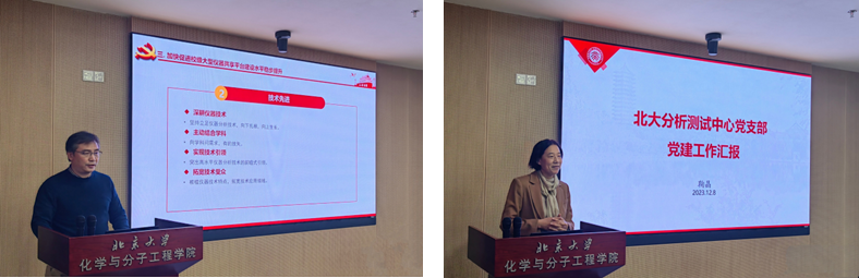 在党建工作交流环节中,分析中心党支部书记、主任薛涛分享了“以习近平新时代中国特色社会主义思想的精髓要义指引高质量平台建设”的微党课,将“六个必须坚持”和校级平台发展紧密结合,报告了中心党支部在深刻把握“我为师生办实事”政策指导实践,推动校级大: 型仪器共享平台建设和党文部+业务等方面的工作开展情况。北大分析测试中心党支部书记鞠晶介绍了中心概况、党支部工作定位、思路和党建特色工作,聚焦发展检测技术,重点介绍了在国产仪器创制方面的实际调研和团队建设案例。