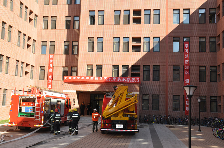 随着火灾警报信号的发出,格园一斋、二斋消防广播同时开启,全体学生用湿毛巾捂住口鼻,按楼内的疏散路线迅速有序跑出宿舍楼。在楼外空地,津南消防支队官兵现场模拟高空消防云梯救人以及内攻火场担架营救伤员情景;校医院医护人员模拟紧急施救,他们组织有序、动作熟练,不仅给在场师生带来火场无情人有情的视觉冲击与内心震撼,更为我校师生形象普及了消防灭火常识以及逃生要领。