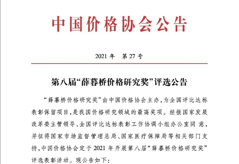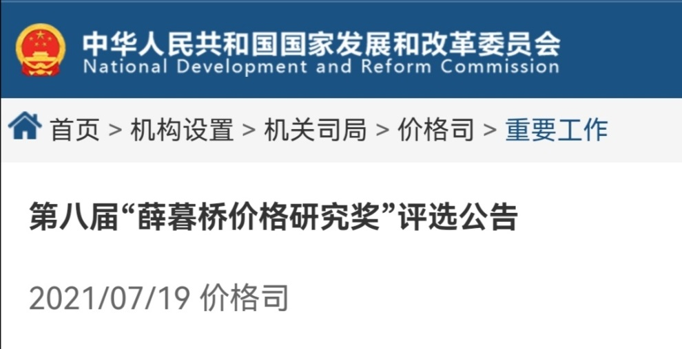 国家发展和改革委员会和中国价格协会对这次评奖高度重视,2021年7月在其网站都发布了第八届“薛暮桥价格研究奖”评选公告,成立了第八届“薛暮桥价格研究奖”评选表彰活动组委会。聘任国家发展改革委学术委员会主任、国家发展改革委原常务副主任朱之鑫担任组委会主任,中国社会科学院学部委员张卓元任副主任,国家发展改革委价格司司长万劲松、二级巡视员朱明龙;国家市场监管总局价监竞争局一级巡视员陈志江、反垄断局副局长徐乐夫;国家医保局医药价格和招标采购司司长丁一磊;中国人民大学副校长刘元春;国家发展改革委价格监测中心主任卢延纯;国家发展改革委价格成本调查中心主任黄汉权;国家发展改革委价格认证中心主任吴涧生;国家发展改革委市场与价格研究所所长杨宜勇、原所长臧跃茹;国家发展改革委中国市场出版社社长郭爱东;国家发展改革委学术委员会秘书长刘中显任委员。