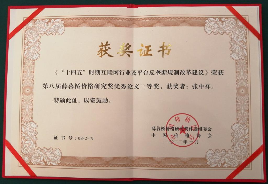 本次评选共有5部著作、30篇论文获得本届“薛暮桥价格研究奖”。国家发展改革委经济体制与管理研究所副研究员李叶妍博士与天津大学马寅初经济学院创院院长、卓越教授,国家能源、环境和产业经济研究院院长张中祥合著的论文“十四五时期互联网行业及平台反垄断规制改革建议”荣获三等奖。