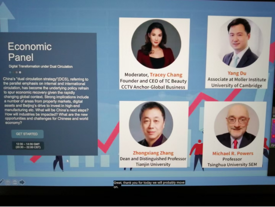 本站讯(马寅初经济学院供稿)第十三届伦敦政经中国发展论坛经济分论坛聚焦后疫情时代双循环新发展格局下的数字化转型和中国经济。清华大学经济管理学院苏黎世保险集团讲席教授、金融系前系主任Michael Powers,剑桥大学穆勒研究所研究员Yang Du,天津大学马寅初经济学院创院院长、卓越教授,国家能源、环境和产业经济研究院院长张中祥应邀发表主旨演讲,曾任美国CNBC财经主播和中国CCTV《全球财经》、《华商论见》栏目主持人的Tracey Chang主持了经济分论坛的讨论。