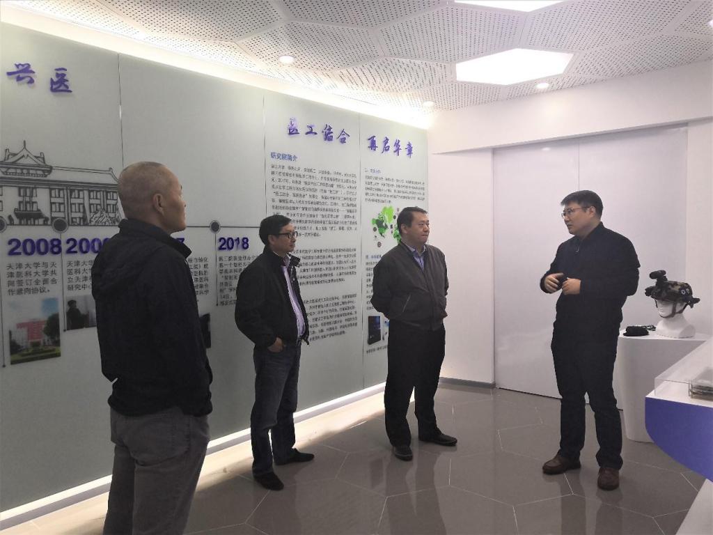 明东首先带领梁允超一行参观了医学工程与转化医学研究院实验楼,分享了印刻在地热塔上的“周虽旧邦、其命维新”的办学决心。在展厅中,明东为来宾详细介绍了天津大学的“兴医”历史沿革、建设理念、师资队伍、科研平台以及科研成果,讲解了人工神经康复机器人系统的康复治疗效果以及太空脑-机交互系统项目的科学价值。