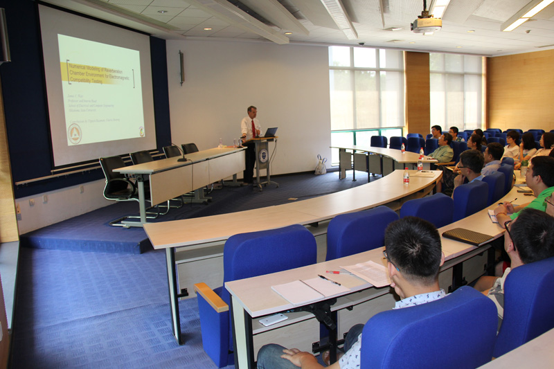 访问期间,West教授还为全校师生做了题目为“用于电磁兼容测试的混响室环境的数值模拟”的学术报告。报告中,他采用了两种新的方法数值模拟混响室电磁环境,一种是通过优化采样室内理想的平面波谱来模拟电磁场的环境;另一种方法是采用矩形腔的腔格林函数实现动量法。报告十分生动,会后老师同学们提问踊跃,积极的与 West教授讨论。