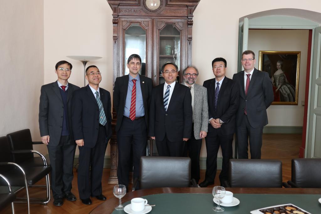 海德堡大学副校长Stephen Hashmi,先进材料中心主任Rüdiger Klingeler等与代表团进行了会见会谈。Hasmi副校长表示非常欢迎天津大学代表团访问海德堡大学,并介绍了海德堡大学的发展历史、学科优势与国际合作情况。胡文平副校长表示十分高兴访问海德堡大学,并介绍了天津大学的历史沿革、科学研究、国际合作等方面取得的成绩,回顾了两校在学生培养上的合作历史,特别介绍了天津大学在国际合作办学方面的发展目标与理念。双方就进一步加强学生交换、教师交流、联合科研等方面的深入合作达成一致意见。
