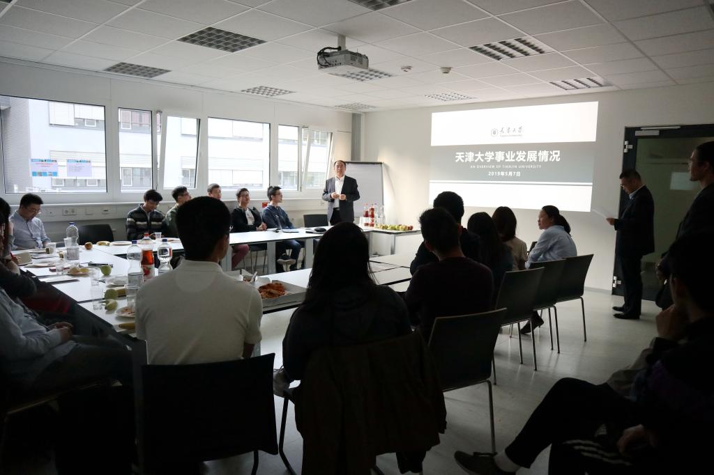 在访问海德堡期间,天津大学在海德堡大学召开事业发展报告会,胡文平副校长介绍了天津大学在科学研究、人才引进、国际合作、学科布局等方面的发展现状,重点讲述了天津市的区位与资源优势、天津大学为青年人才搭建的发展平台与支撑条件等,并表示十分欢迎在德学子来天津大学发展自己的学术事业。人事处处长杜青详细解读了国家、天津市与天津大学对人才引进、人事制度改革、薪酬体系等政策,介绍了对学校为人才引进提供的全方位支持服务,并表示将竭尽全力为青年学者创造成就一流事业的一流条件,诚挚欢迎广大青年才俊到天津大学工作。精仪学院副院长田震为参加报告会的学子做了个人事业发展心得的分享,结合自身科研选题与天津大学相关平台支持介绍了青年人才的发展道路与经验,并表示国内的高速发展为青年学者提供了良好的发展机遇,希望有更多青年人才加盟天大,回到祖国成就一番事业。
