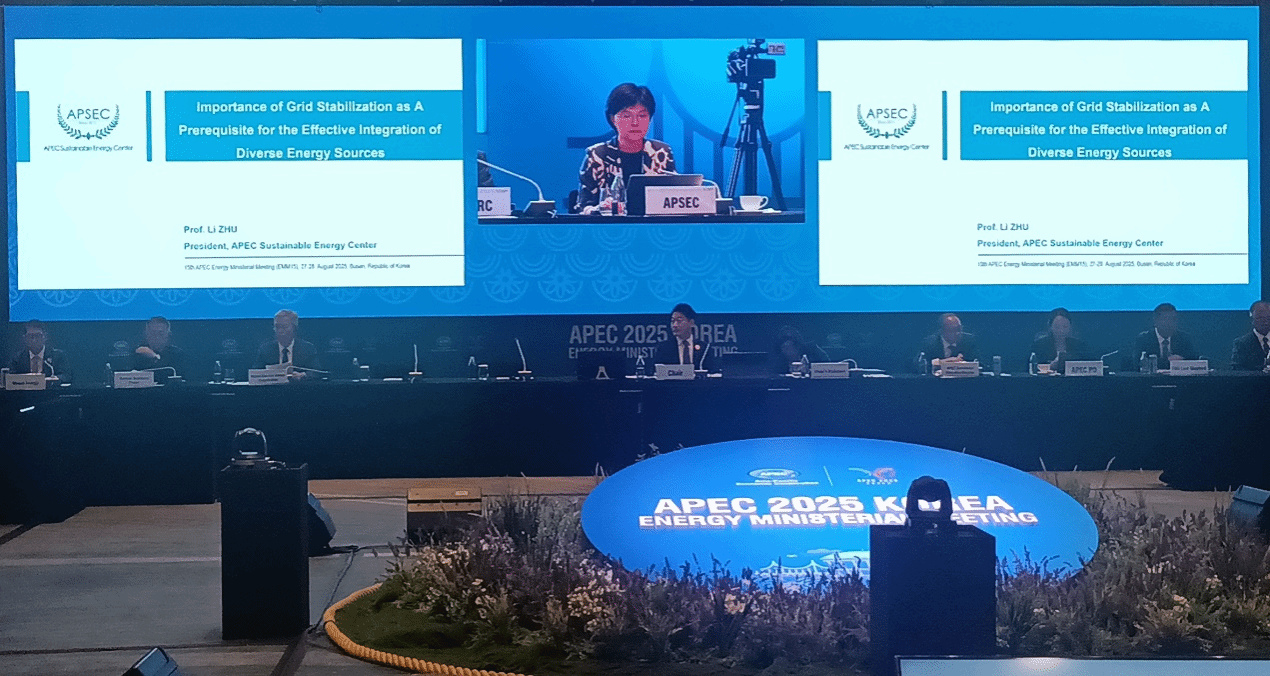 8月27-28日举行了EMM15会议,会议主题为韩国选定的“加速可持续、可负担、可靠、安全和创新的能源,共创繁荣未来”,并契合APEC 2025韩国主题“共筑可持续的明天:连接、创新、繁荣”。除墨西哥外,其余20个APEC经济体均派代表参加了本次能源部长会议。8月28日,在EMM15的“强化电网安全与运行可靠性”专题会议环节,APSEC主任朱丽教授应邀做了题为“电网稳定:多元化能源整合的关键前提”的专题报告,分析了APEC区域能源和电力低碳转型发展的新机遇,大规模高比例可再生能源背景下电网稳定性面临的主要挑战,提出了通过构建“源网荷储一体化”的新型电力系统强化电网安全与运行可靠性的相关建议,并向与会代表发出APSEC十一周年庆暨第十一届亚太能源可持续发展高端论坛活动的邀请。