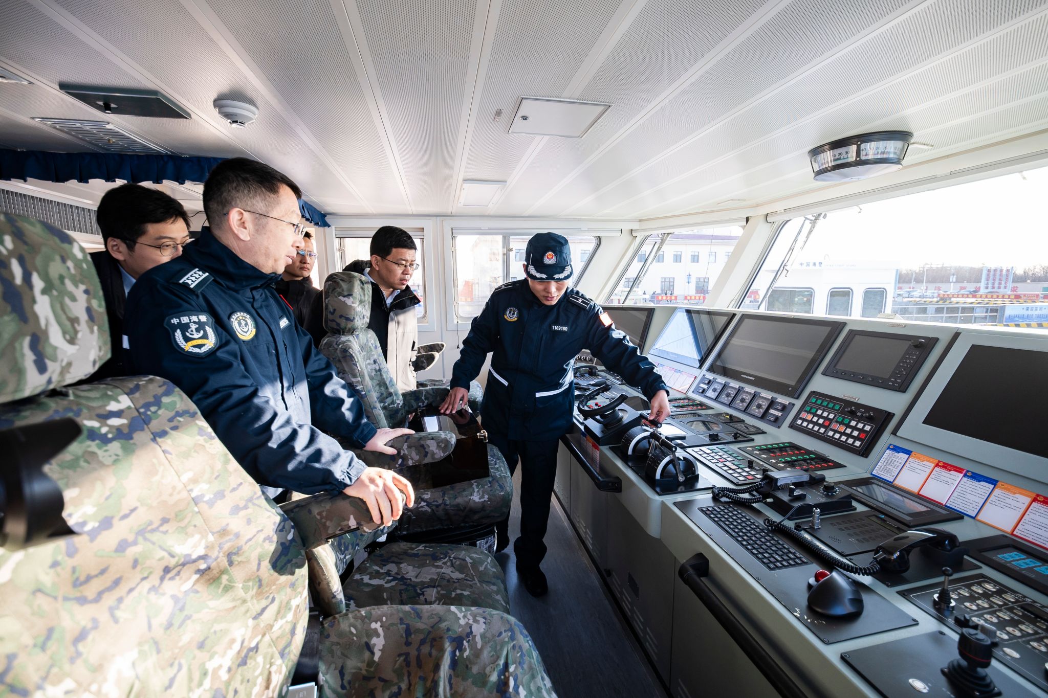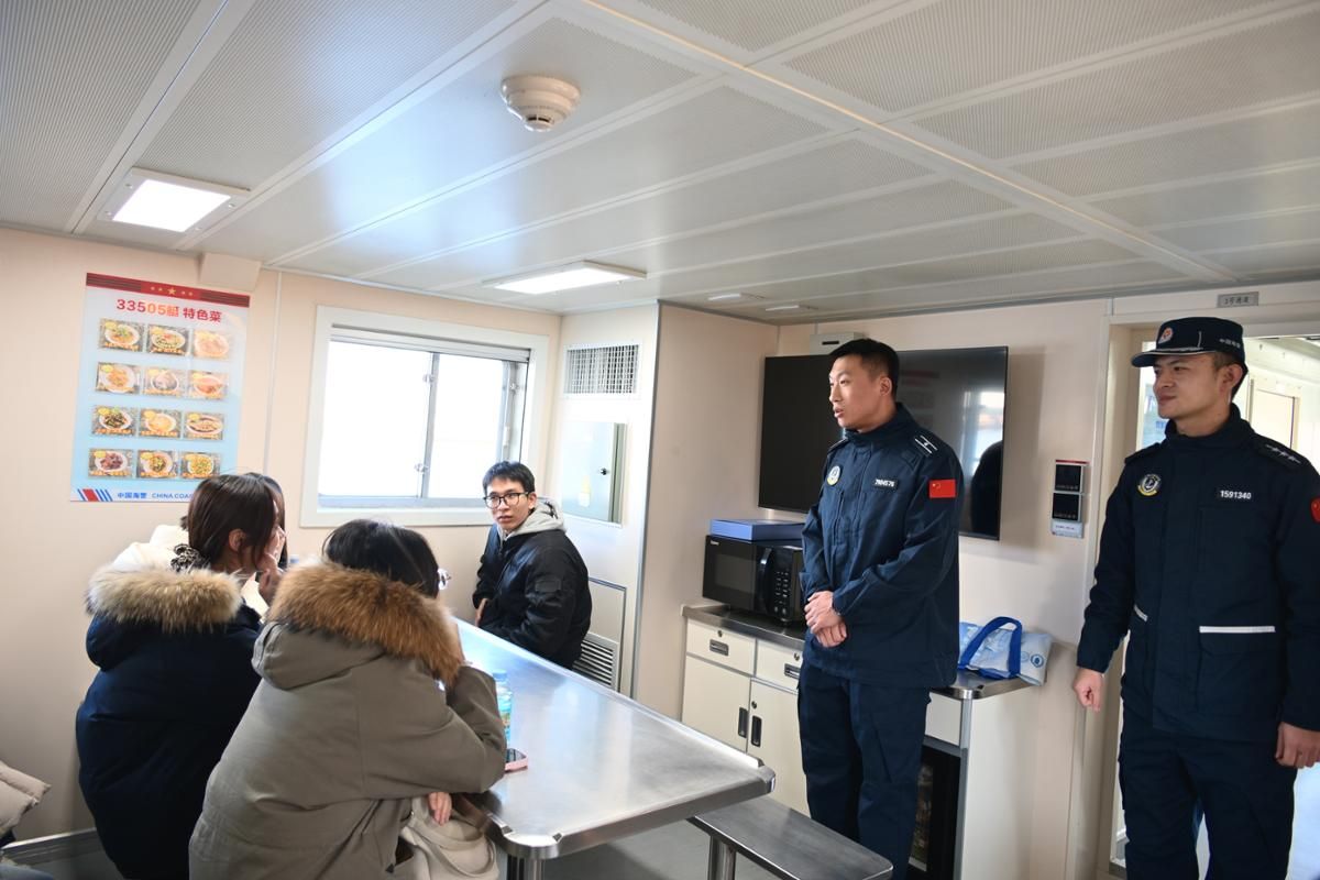 师生随后登上海警“蓝鲸艇”,在执法员引导下依次参观甲板作业区、船员生活舱、指挥控制台等重要区域。通过近距离观察舰载设备、住舱环境与操控系统,师生对海警舰艇的功能布局与执勤条件形成了直观认识,也切身感受到海上长期作业对人员身心素质的严苛要求。在指挥控制台前,执法员现场演示了航行监控与任务指挥流程,进一步揭示了海警海上勤务的专业性与系统性。师生深刻体会到海警执法员在空间有限、环境动荡的舰艇上坚守岗位的艰辛,以及他们为维护海洋安全所付出的日常奉献。