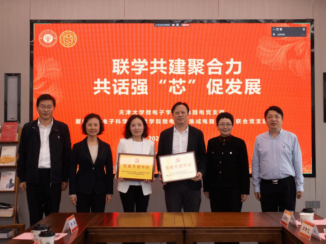 党支部共建授牌仪式上,在石慧霞、陈忠、贾果欣、马凯学的共同见证下,厦门大学电子科学与技术学院微电子与集成电路系师生联合党支部与我院微电固电党支部代表互授“党建共建单位”牌匾。下一步,微电固电党支部、微电子与集成电路系师生联合党支部将以本次共建为契机,深化在科创竞赛联合指导、产教融合项目协同推进等方面的合作,共同助力微电子领域人才培养与技术创新。