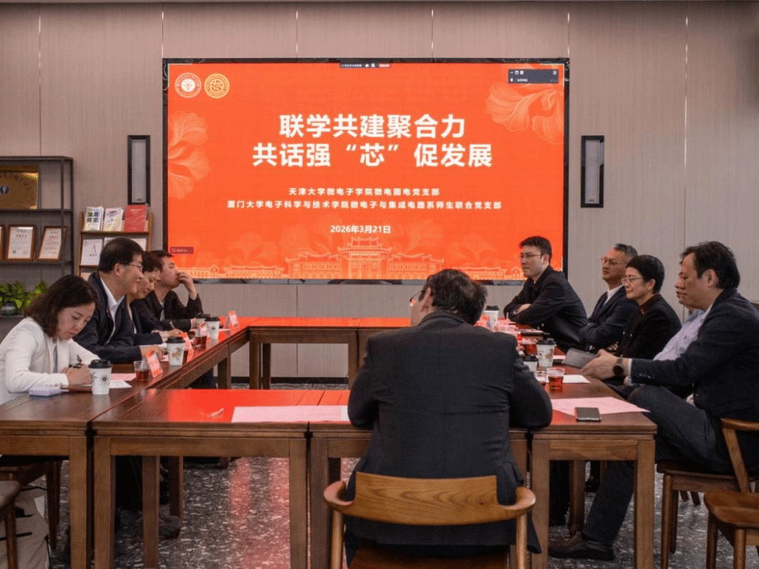 联学共建座谈会在厦门大学南存钿楼嘉德湖畔“电子人之家”举行。厦门大学电子科学与技术学院党委书记石慧霞、原院长陈忠,厦门大学校友会电子分会理事长李希龙、天津大学微电子学院党委书记贾果欣、院长马凯学等出席座谈会。座谈会由厦门大学电子科学与技术学院副院长李澄主持。