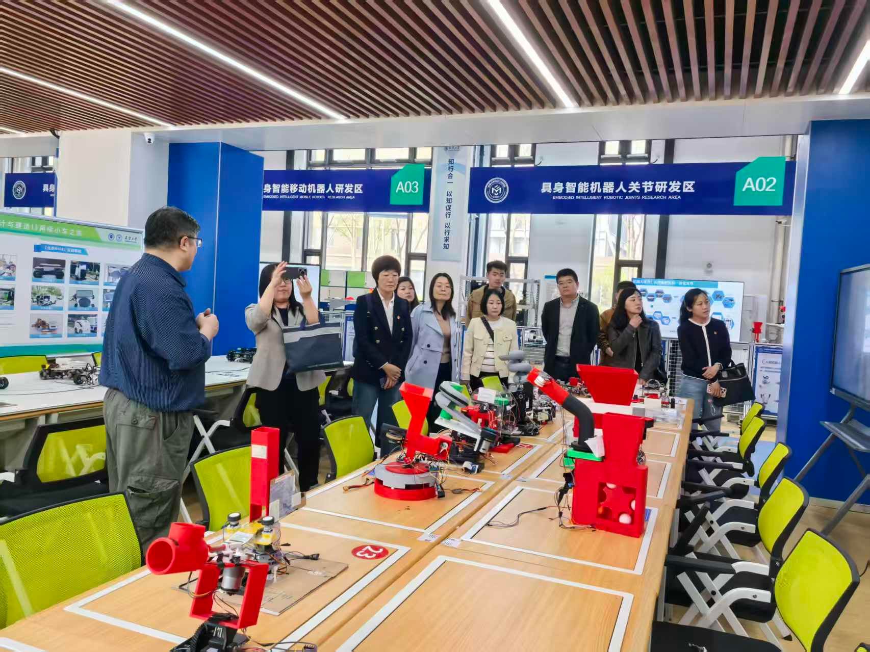 联学共建活动开始前,孙涛书记和秦旭达主任首先带领天津职业大学各位老师参观了设计与智造未来学习中心和机构理论与装备技术教育部重点实验室。在设计与智造未来学习中心,郑惠江老师和秦旭达老师详细介绍了机械工程学院面向新工科3.0升级版新要求,开设的各类新工科实践课程,展示了学生们在具身智能机器人、智能制造方面的创新成果,这些研究成果受到了天津职业大学各位老师的高度评价。