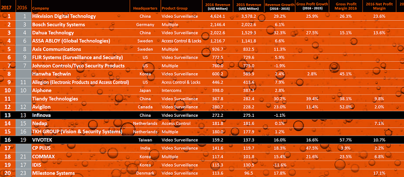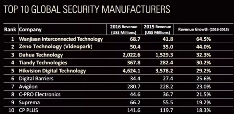 从营收增长来看,天地伟业营收增长率排名全球第四