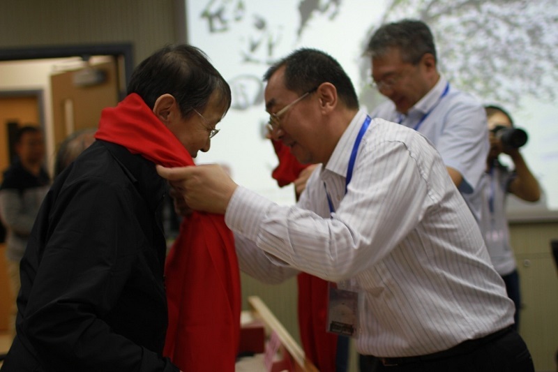 随后,大家一起观看了怀旧视频《三十年风雨,三十年情》。一张张照片,一首首老歌,唤醒了埋藏在心底三十年的校园时光。那些年一起度过的青春岁月随着视频的推进也渐渐明朗起来,看到那些熟悉而年轻的面孔,校友们在相视一笑后轻轻抹去眼角的泪珠。曾经的岁月,满是一同经历的故事,照片上的他们虽然变了容颜,但那份真挚的情谊却从未改变。视频播放后,同学们上前为老先生们送上红围巾,表达对老师们的感谢和祝福。