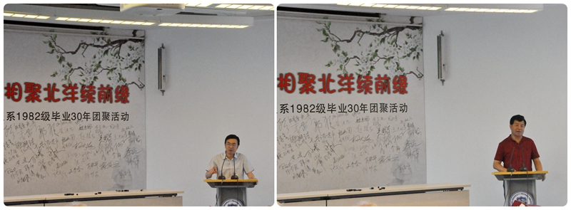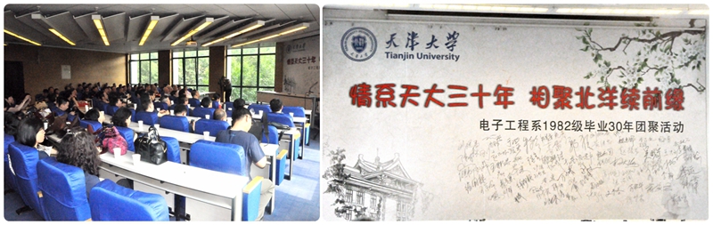 活动第二阶段为班级校友代表发言。首先是无线电技术甲班的秦克景校友,他发自肺腑的表达了浓浓的同窗情谊,“三十年的时光,曾经的青春少年早已斑斑华发,曾经的懵懂与青涩,也早已在时光的长河中,经历了人生百味。但是回首这三十年来,我们的友谊从不曾因岁月的流逝、境遇的变迁而褪色,相反却愈加的香醇与浓郁,如诗如歌”;无线电技术甲班的沈金华校友说道,“三十年后,重走天大校友,深深的感觉到了母校巨大的变化与发展,心中不由地激动与澎湃,三十年前,母校是我们的骄傲,如今,我们依旧为母校感到骄傲与自豪”;在表达母校情之余,无线电技术乙班的朱连兴校友认为,“走出校园的这三十年,其实感触最深,影响自己最大的就是母校教会我如何做人,天津大学一脉相传的踏实奋进、实事求是的学风与作风,早在学生时代就落下了深深印记,督促自己不断努力向前,从而影响了自己一生”;电子仪器甲班的崔惠柳结合自己的人生感受,与同学们分享“回首三十年的时间,不论我们是功成名就,还是默默无闻,能够留下的最大财富就是平安与健康,所以祝愿在座的每一位同学和老师,拥有健康的身体,平安幸福”;同样,电子仪器乙班的张建国校友也从人生经历中,感受到了母校深深的影响,与同学们分享了他的“try”故事,“当年读书的时候,我的英语成绩一直都不好,英语老师一直跟我说要try,大胆的尝试,但是当时并没有迈出那一步,毕业后,经历了社会的洗礼,才发现自己一直都在“try”,在人生的不同阶段,事业的不同领域,自己尝试的步伐从来没有停止,所以现在来看,这种拼搏、大胆尝试的思想一直都是母校教诲自己的。”半导体专业的吴军军校友用一句话道出了校友的心声,“常怀感恩之心,常念同窗之情”,也道出了对同学们的祝福,“人生两个阶段,前半段是用来追求志向与理想,后半段则是追求幸福,所以希望我们的老同学,能够保重身体,幸福快乐”。六位校友代表的精彩发言,虽然言语不同,但是都蕴含了对母校、对老师、对同窗好友的深情,都表达了道不尽的感激之情。