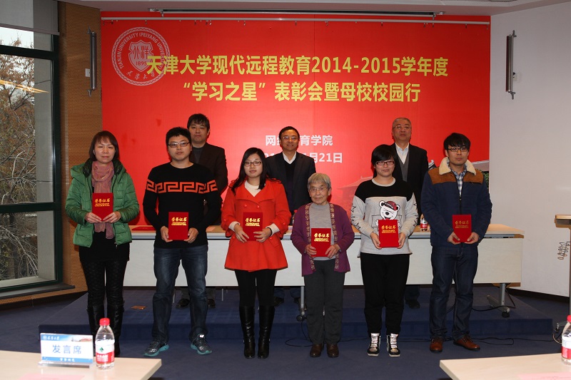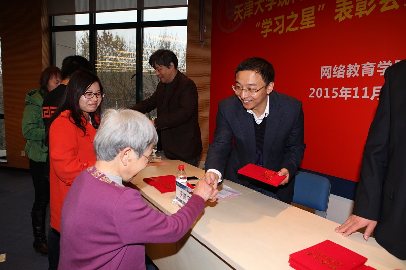 网络教育学院副院长郭强宣读了《天津大学现代远程教育“学习之星”表彰决定》,沈迪等266名同学被授予天津大学现代远程教育2014-2015学年度“学习之星”荣誉称号并受到表彰。其中,一位特殊的学生格外引人注目,她就是网络教育学院第八学习中心电子商务专业专升本学生、79岁的薛敏修老人。她冒着严寒参加活动,院长李振宇亲切地喊她老奶奶并为她颁发“学习之星”荣誉证书。