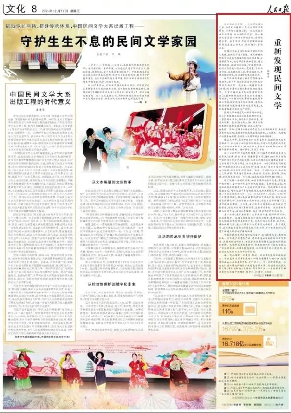从上世纪50年代的民歌调查,到1984年中国民间文学三套集成(故事、歌谣、谚语)普查编纂工作,再到2003年启动的中国民间文化遗产抢救工程,三次大规模抢救性调查成果有一大批填补了中国文学史、文化史的空白。如今,摆在我们面前的“中国民间文学大系出版工程”成果,更是一笔巨大而珍贵的文化财富、文学财富、精神财富。这是一部空前的大书、真正意义上的典籍,所具有的原始性、原真性、文献性、整体性、系统性、资源性无可比拟。可以说,这是我们这个时代的《诗经》。