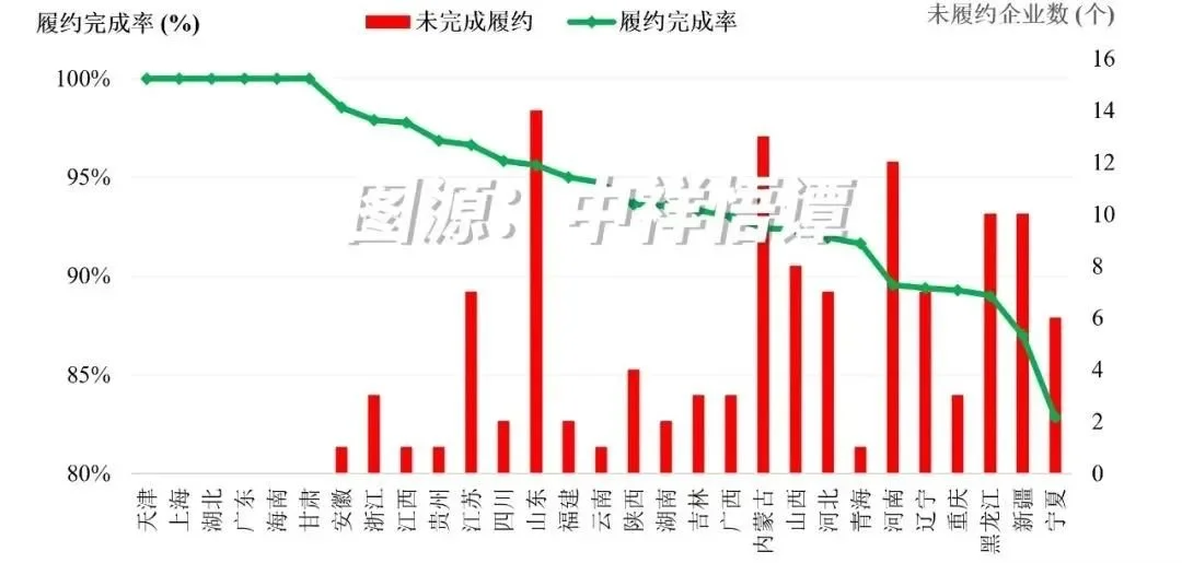 鉴于排放交易被认为是帮助控排企业以最低成本履行减排义务的一种手段,履约完成率是评估排放交易制度绩效的关键指标,而政府尚未公布根据控排企业数量衡量的履约完成率这一重要数据。本文围绕此问题开展了大量的工作,最终整理出全国分省控排企业履约数据,发现全国有121家控排企业没有完成履约,按企业数量计,全国履约完成率为94.4%,比国家公布的按履约量计的履约完成率低5.1%。而且,各省市履约存在明显差别,六省市100%完成履约,但最低的省只有82.9%,全国有14个省市履约率低于全国94.4%的平均水平。