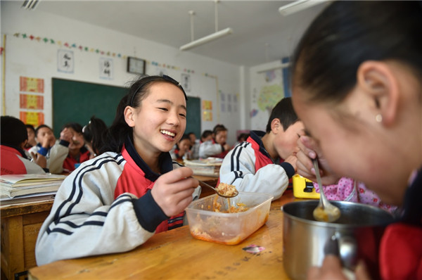 图为2016年12月15日,宁夏中宁县宽口井中石油希望学校的学生们在吃免费午餐。  新华社资料图