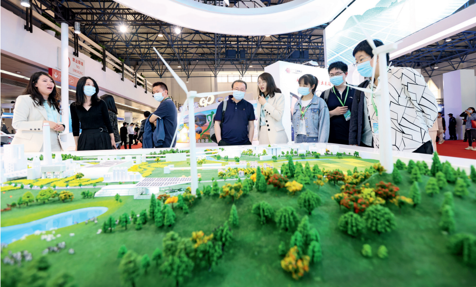 2021年4月20日,2021中国国际清洁能源暨综合能源服务产业博览会在北京举行。图为工作人员在向参观者介绍清洁能源生产展示沙盘。