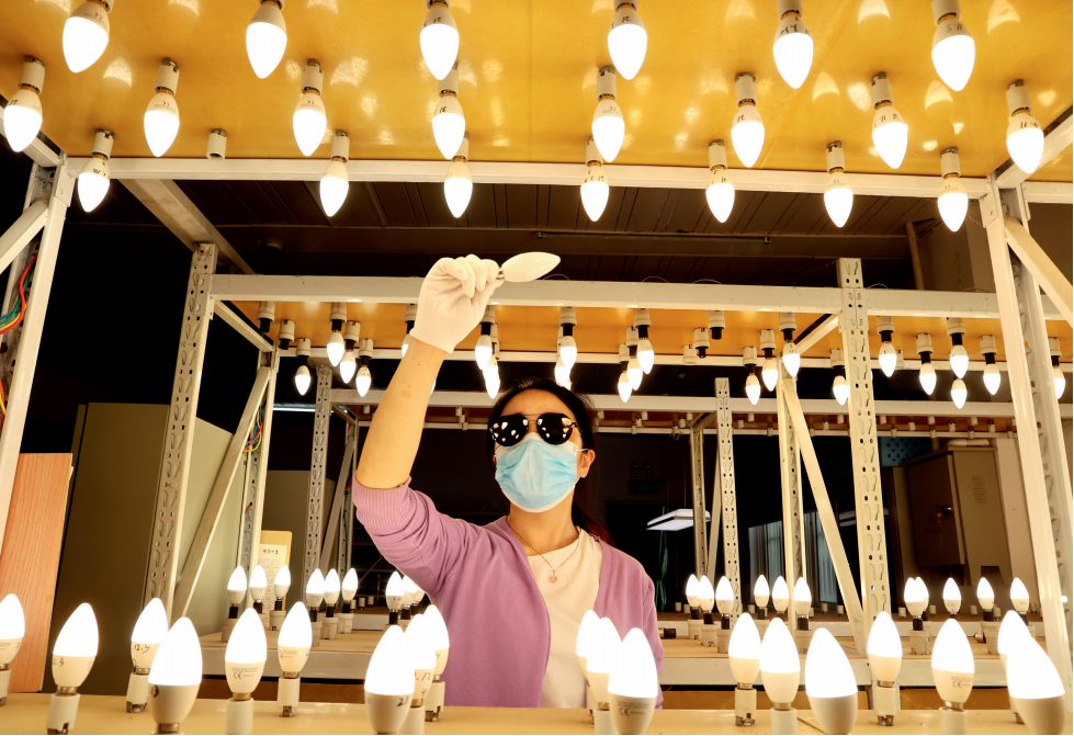 6月17日,在江苏连云港海州区锦屏工业园,工人在检验一批绿色节能灯具。