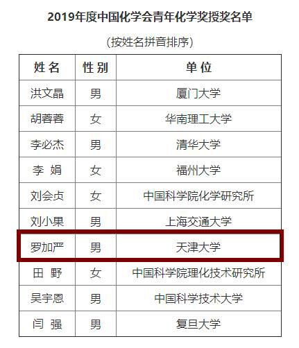 本站讯(通讯员 李莎)2019年12月23日,中国化学会进行公示,天津大学化工学院教授罗加严入选2019年度中国化学会青年化学奖。