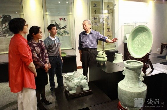 在杭州建国际瓷文化交流中心,是“复活国宝的名瓷大师”叶宏明多年的心愿。叶老说,浙江是瓷器的发源地,又在“官、哥、汝、定、钧”五大名窑中独占其二。让国宝重放异彩,推陈出新,在杭州建国际瓷文化交流中心,有着历史、文化等多方面得天独厚的有利条件。为此,他曾在全国政协会议上,在钱江晚报人文大讲堂上多次呼吁(相关报道见钱江晚报2010年9月7日B7版)。今天,叶老的梦想照进现实,在建设文化大省的鼓角声中,在浙江省和杭州相关领导和部门的大力支持下,“御富永藏——叶宏明古陶瓷工作室”正式落户西湖文化广场国家文化产业基地,向公众开放。一生心血付与瓷的叶老希望把自己的工作室办成国际瓷文化的交流中心,为陶瓷事业再尽一份心力!