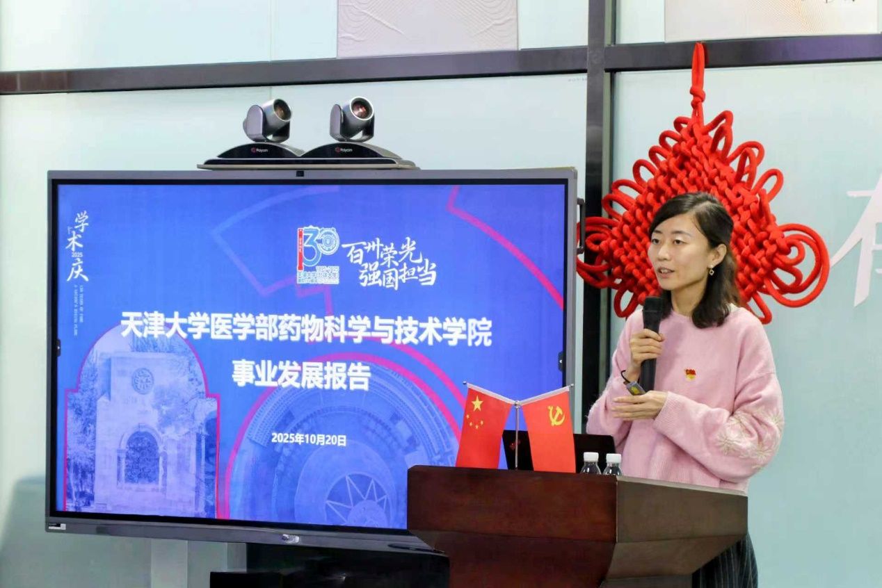 天津大学药学院院长刘秀云在发言中,首先对华润双鹤的热情接待与经验分享表示感谢。她强调了党建工作对业务发展与科学研究的引领作用,指出扎实的党建是推动事业前进的强大动力。随后,刘秀云与参会嘉宾共同学习了习近平总书记在天津大学成立130周年之际,给天津大学全体师生的回信,并强调学院将牢记习近平总书记嘱托,聚焦国家重大战略需求,为健康中国建设贡献坚实力量。接下来,刘秀云系统介绍了天津大学及其医学部、药学院的发展历程与现状,她提到,今年是药学院建院25周年,正处在快速发展时期,已形成鲜明的学科特色与科研布局。她详细阐述了学院在人才培养、科研平台建设以及前沿药物研究方面取得的成果,并表示希望未来能与华润双鹤这样具有深厚历史底蕴和强大创新实力的企业加强联系,在科研项目联合攻关、成果转化、人才培养等方面探索创新合作模式,共同服务于国家医药卫生事业的重大战略需求。