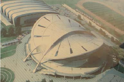 东丽体育馆下部结构为钢筋混凝土框架结构形式,上部屋盖结构为空间桁架结构体系。屋盖设计运用了仿生学原理,模仿蝴蝶的形态,使体育馆造型美观,轻盈而富于动感。屋盖由拱状的主桁架,副桁架,呈空间双曲线的两榀环桁架,以及一些次桁架和系桁架组成,平面99.5m×96.5m。
