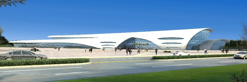 射击馆建筑造型酷似比赛枪支,充分表现了射击运动中子弹出膛般的速度感。射击馆共有六片屋盖,覆盖下部结构,屋盖为曲面屋盖,自东向西逐渐降低。