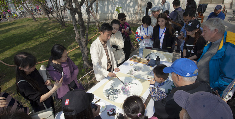 “绘海棠·忆黾翁”刘珺老师现场泼墨画海棠 游人驻足欣赏 赵习钧摄