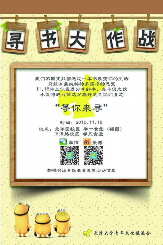 11月18日青年文化促进会发起捐书—丢书活动。12:15在卫津路校区学五食堂与北洋园校区学一食堂,大家捐出自己想要推荐的书籍,由青促进行筛选分类并贴上标记后将图书“丢”在校园各个角落。