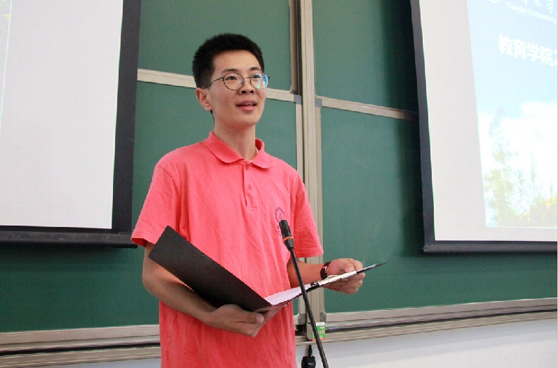 2014级学生安海波代表本科老生发言。他分享了自己离开家乡来到天津求学,在老师、同学们的关心、帮助下融入教育学院这个温暖大家庭的心路历程。他说,自立、自信、思想、理想,是在大学之道上必将经历的成长与收获。他勉励同学们要与努力和自立为伴,做一个卓越的教育学院人。