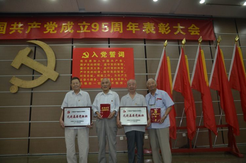 会后,具有73年党龄的老同志刘振昌、具有70年党龄的老同志印邦炎、具有68年党龄的老同志郝瑞峰以及已有66年党龄的老同志杨庆文由离退休处工作人员陪同,怀着激动的心情在党徽和党旗下合影留念。