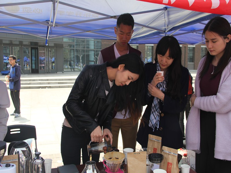 向图书馆走去,一缕香气萦绕在鼻腔,寻香看去,是天津大学咖啡俱乐部举办的“咖啡鉴赏”活动。摆放咖啡的桌子前围满了人,每人答题之后都得到了一个海棠脯和一杯咖啡。同时他们冲咖啡的工具也给参与者使用,还手把手指导参与者如何制作沁人心脾的咖啡。同学们边品咖啡边观看制作过程,一杯咖啡品完还是意犹未尽。从同学的交谈中了解到,许多游人都是被咖啡的香气吸引而来的,也对咖啡的冲制产生了极大的兴趣。