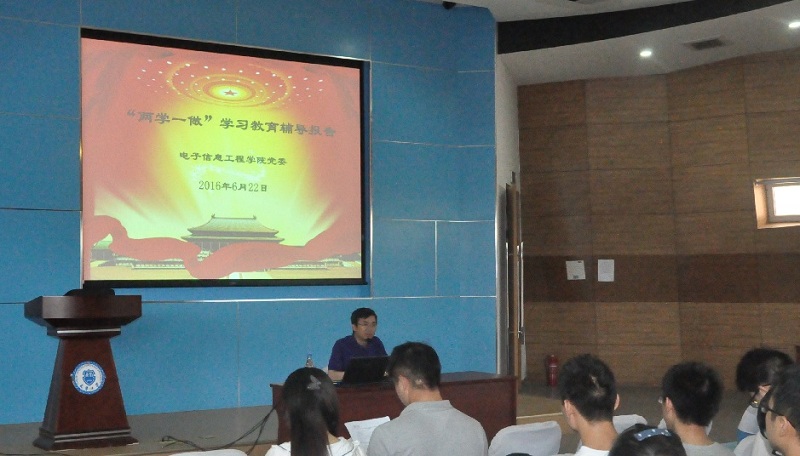本站讯 (通讯员 杨烁)6月22日,按照 《天津大学关于在全体党员中开展“学党章党规、学系列讲话、做合格党员”学习教育的实施意见》要求和部署,信息学院党委书记杨欢在学院报告厅为学生党员讲解“两学一做”专题党课,学院党务秘书赵雪、学院团委副书记刘佳、卫津路校区信息学院学生党支部书记、委员共60余人参加本次学习。