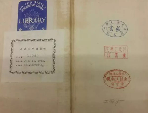 我们在此次布展中发现的最早入藏图书的时间是1903年。据史料记载,截至1934年,我校馆藏西文图书21256册。抗战期间北洋大学图书资料损失惨重,抗战后从天津市立第一图书馆收回散失图书200余箱;从德商新华公司、美商慎昌洋行取回抗战前寄存的图书60箱,再有李书田院长从西安辗转带回的一些西迁图书。在布展过程中,我们惊喜地发现了李书田、魏承孝等人的借书记录卡。整理中我们还发现一些带有抗战纪念意义的图书,看似普通的卡片清晰记录了我们民族和我们学校曾遭受的大劫难和大胜利,控诉了70年前日本帝国主义的侵华罪行。抗战复校后,为补充馆藏,大量师生校友及社会各界人士向图书馆捐赠图书,其中就有著名校友叶叔衡、李安格等人的毕业赠书。有一本书的扉页上写着:“邓乃友,1951.1月8日,光荣地走上了祖国的国防岗位,谨以此书赠给母校”,字里行间洋溢着自豪、喜悦和对母校的眷恋。
