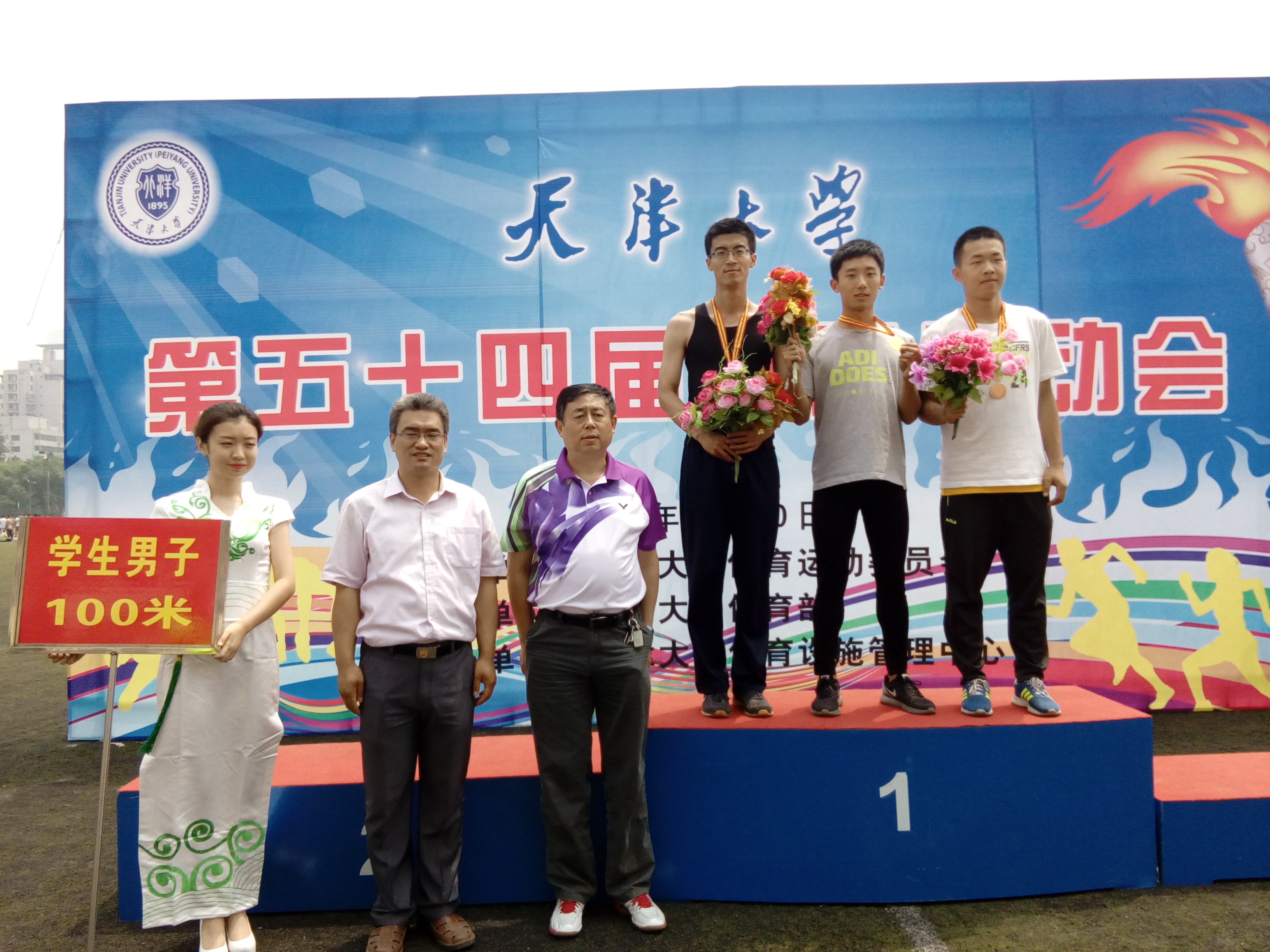 本站讯(学生记者 摄影 陈可心)随着热烈欢快的水鼓舞的结束,天津大学第54届校运动会正式开始。前来开场的是学生组100米赛跑,经过前期的预赛,今天场上的每一位选手都信心满满。红旗挥舞,枪声响起,只见一道道闪电在运动场上一闪而过,同学们争分夺秒,输赢就在毫秒之间。在同学们的欢呼声中,女子100米的桂冠被经管学部王玮夺得,获得第二名和第三名的分别是理学院的宫如悦和建工学院的张莲。随后校党委副书记李义丹和体育部主任韩文俊为获奖选手颁奖。男子组100米的前三名分别是信息学院的刘近贤,自动化学院的戴文凯和材料学院的祁毓豪。在热烈的掌声中,校党委副书记李义丹和体设中心主任韩冰霜与他们握手表示祝贺,并为其颁奖。