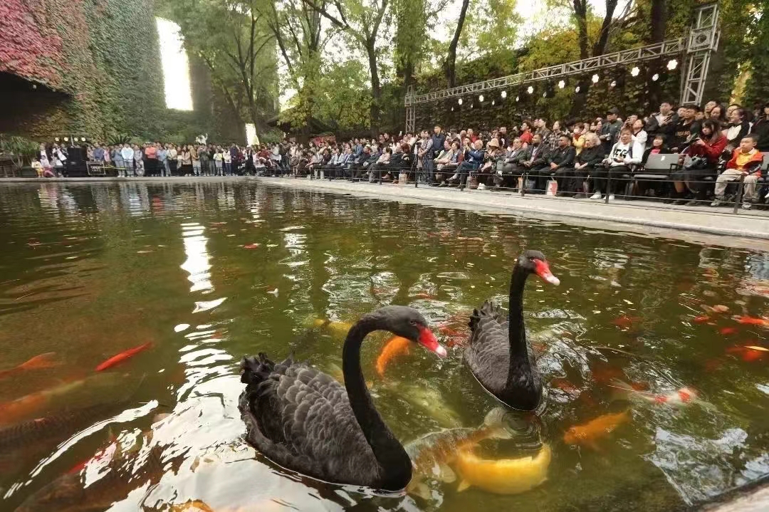 2020年第二届“红叶季”,适逢天津大学125周年校庆和冯研院15周年院庆。澄心池上第一次搭起了舞台,一台文艺界名人荟萃的“双庆诗歌音乐会”令人难忘。2023年,“红叶季”又一次搭起水上舞台,不仅有红叶、碧水、翠竹、锦鲤相映成趣的天然布景,还多了2只黑天鹅和一群野鸭绕台嬉游,与人合鸣。