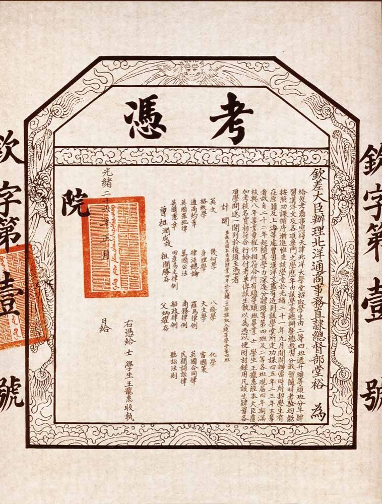 1895年北洋大学堂创立于天津,在中国最早实行学门分科制,设置律例、矿冶、机械、工程四个学门,后开设师范班、铁路班;在堂下兴办铁路学堂;俄语班、法语班也陆续开设。分科培养人才的同时,兼顾打通基础。法科优等生第一名王宠惠所获的钦字第一号考凭(第一张中国大学文凭)上列出一名法科专业学生所修习的基础课程。按学门分科进行教学的方式,首次将西方现代知识纳入中国大学的教学体系中,使西方现代知识在中国与国家自强和推动中国近代化发展进程有了契合交汇点。直到1895年底,北洋大学堂的建立使青年有机会学习到除了人文之外其他领域的知识,这也是中国历史上第一次年轻人有机会学习到物理、化学、高等数学、地理和其他一些跟人文、铁路和机械工程相关的自然科学和国际法学。在经年的碰撞与嬗变中,中国传统的“经史子集”四部之学,逐步被替代为西方的七科之学。民国时期,也有教育改革曾提到学校需有三科者,方可称为大学;亦有推行实科教育,增进实科人才运动。然而,追溯这些变迁与变化,实来自于中国第一所现代大学北洋大学堂建立起来的分科教学。