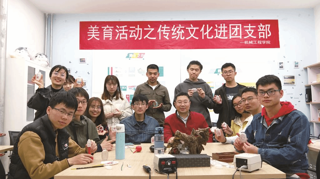 以“杨柳青年画文化艺术传承基地”为依托,在双校区6个学院同时开展了中华优秀传统文化进团支部活动。6位民间艺术家与青年学生就内画、剪纸、木板烙画、面塑、彩塑等5个传统艺术项目进行教授和演练,让学生充分体会中华优秀传统文化的魅力。