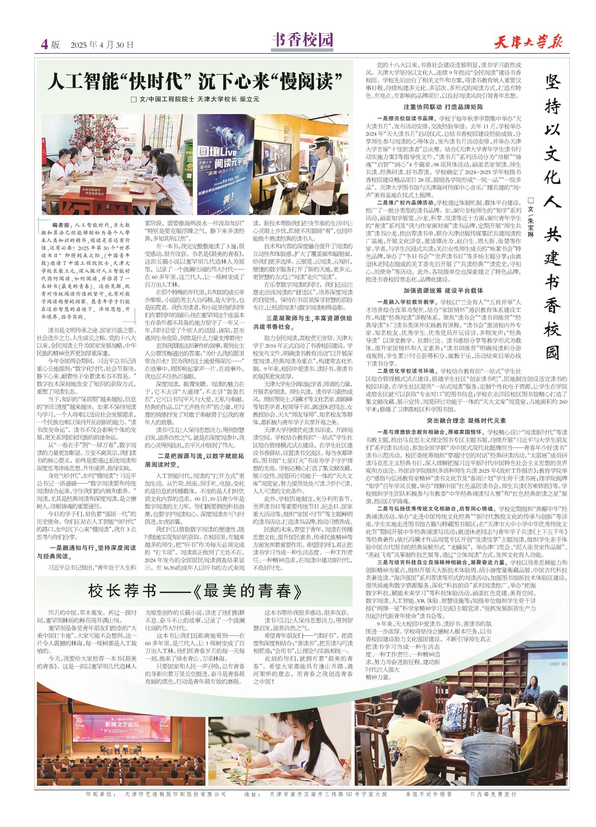编者按: 人工智能时代,当大数据和算法已经能够轻松为每个人带来人类知识的精华,阅读是否还有价值、还有必要?2025年第30个“世界读书日”即将到来之际,《中国青年报》邀请了中国工程院院士、天津大学校长柴立元,深入探讨人工智能时代因何阅读、如何阅读,并推荐了一本好书《最美的青春》。这些见解,既有对传统阅读价值的坚守,也有对数字阅读趋势的洞察。愿青年学子们能在这些智慧的启迪下,淬炼思想、升华境界、指导实践。