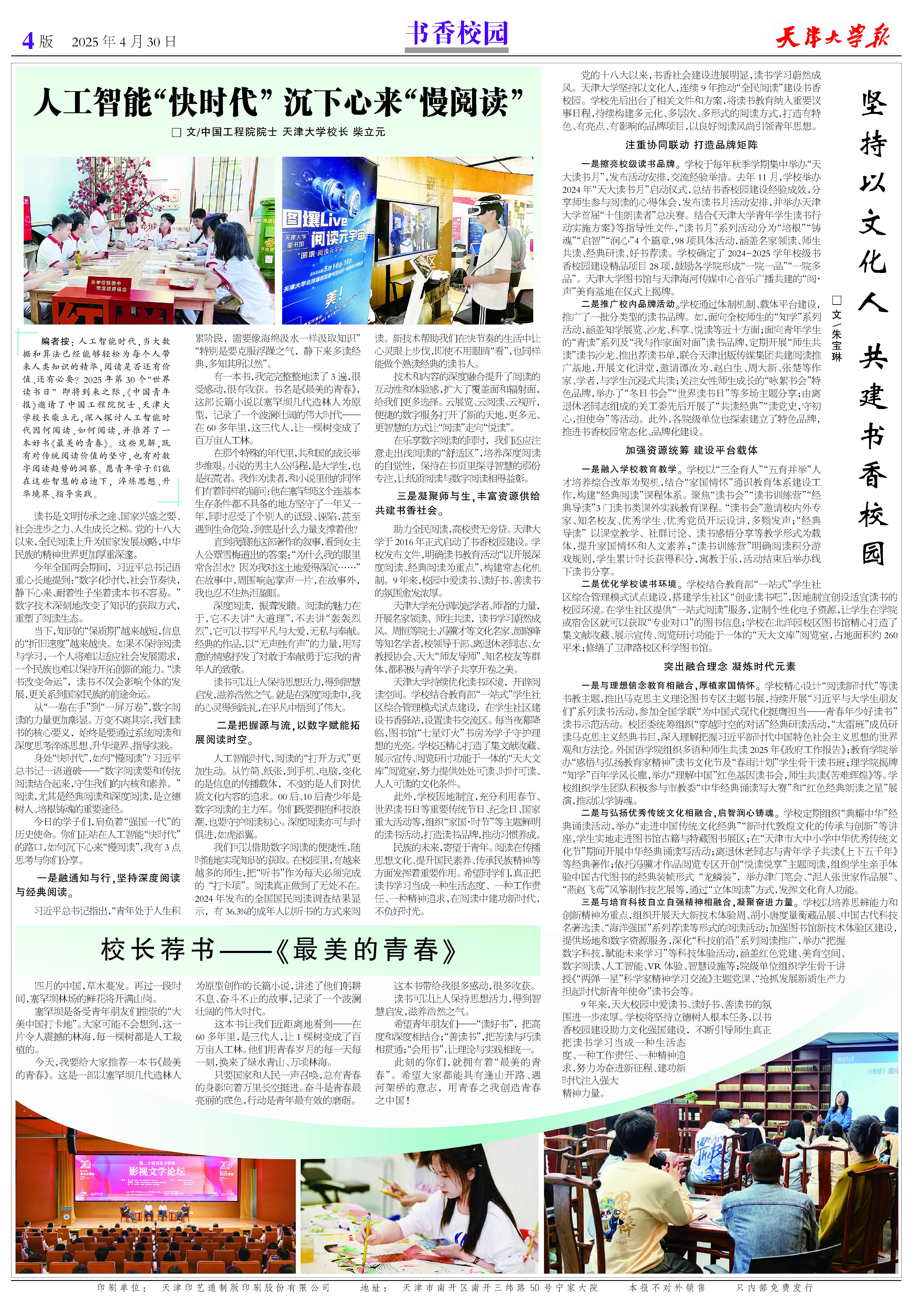 助力全民阅读,高校责无旁贷。天津大学于2016年正式启动了书香校园建设。学校发布文件,明确读书教育活动“以开展深度阅读、经典阅读为重点”,构建常态化机制。9年来,校园中爱读书、读好书、善读书的氛围愈发浓厚。