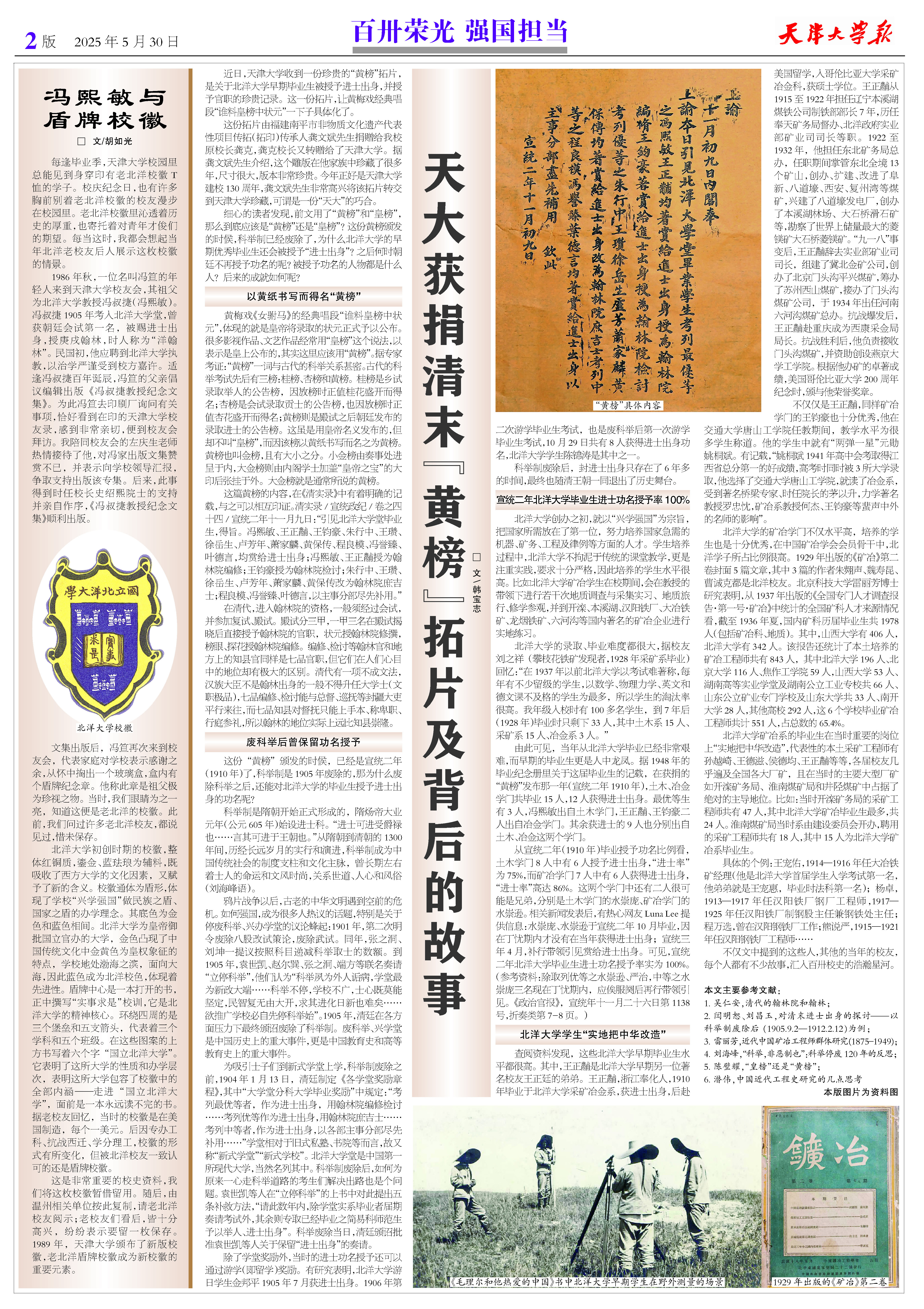 近日,天津大学收到一份珍贵的“黄榜”拓片,是关于北洋大学早期毕业生被授予进士出身,并授予官职的珍贵记录。这一份拓片,让黄梅戏经典唱段“谁料皇榜中状元”一下子具体化了。