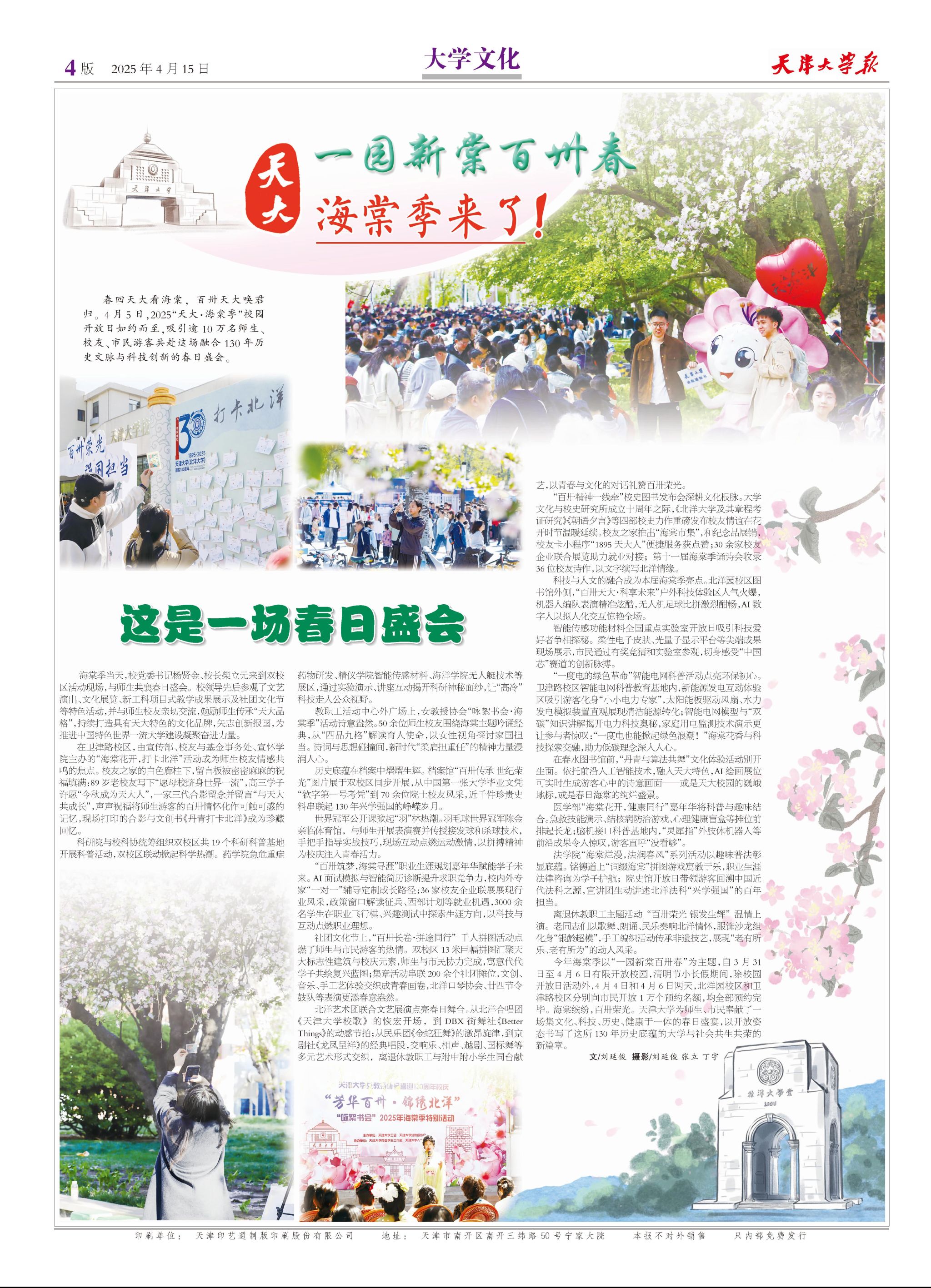春回天大看海棠,百卅天大唤君归。4月5日,2025“天大·海棠季”校园开放日如约而至,吸引逾10万名师生、校友、市民游客共赴这场融合130年历史文脉与科技创新的春日盛会。
