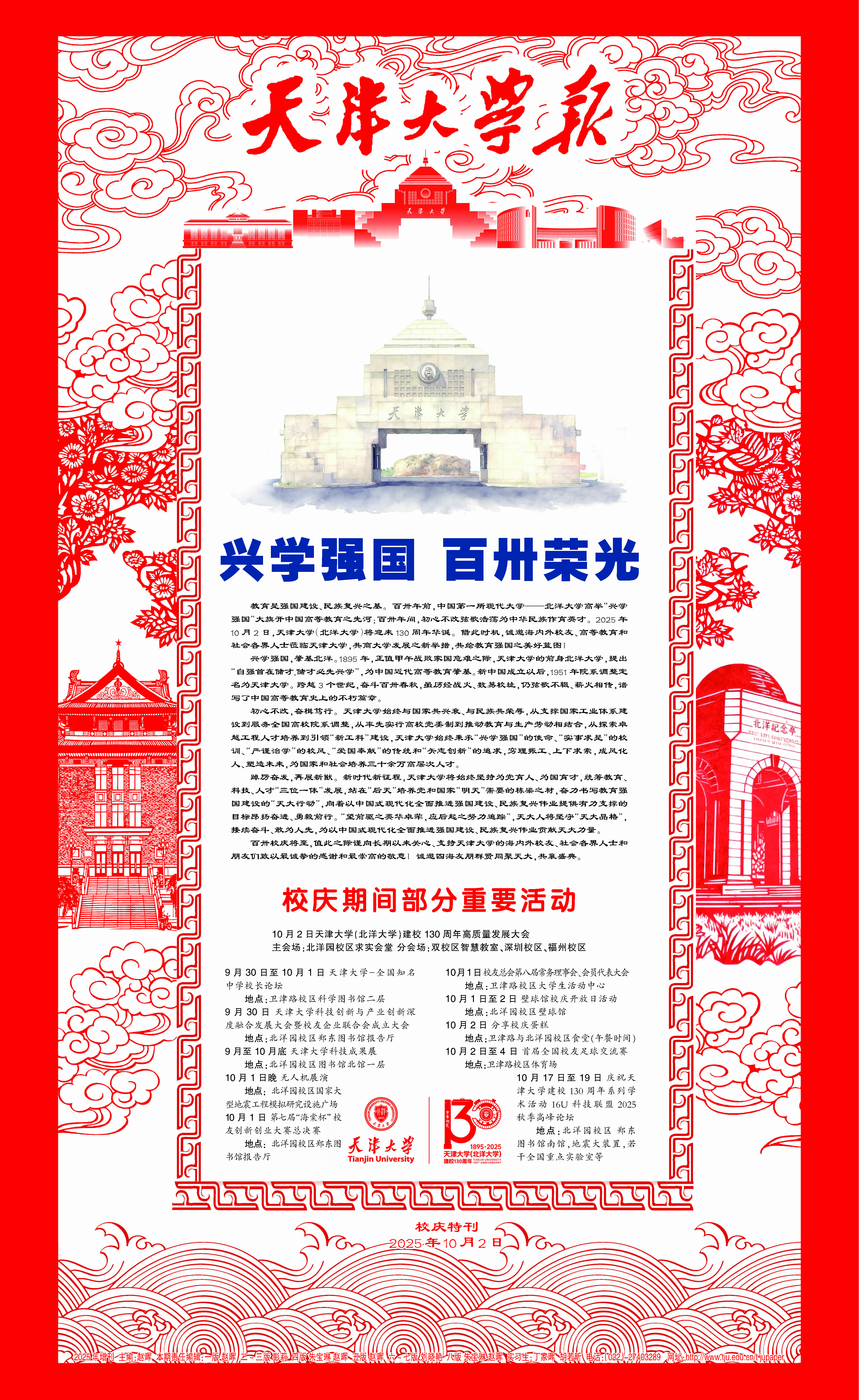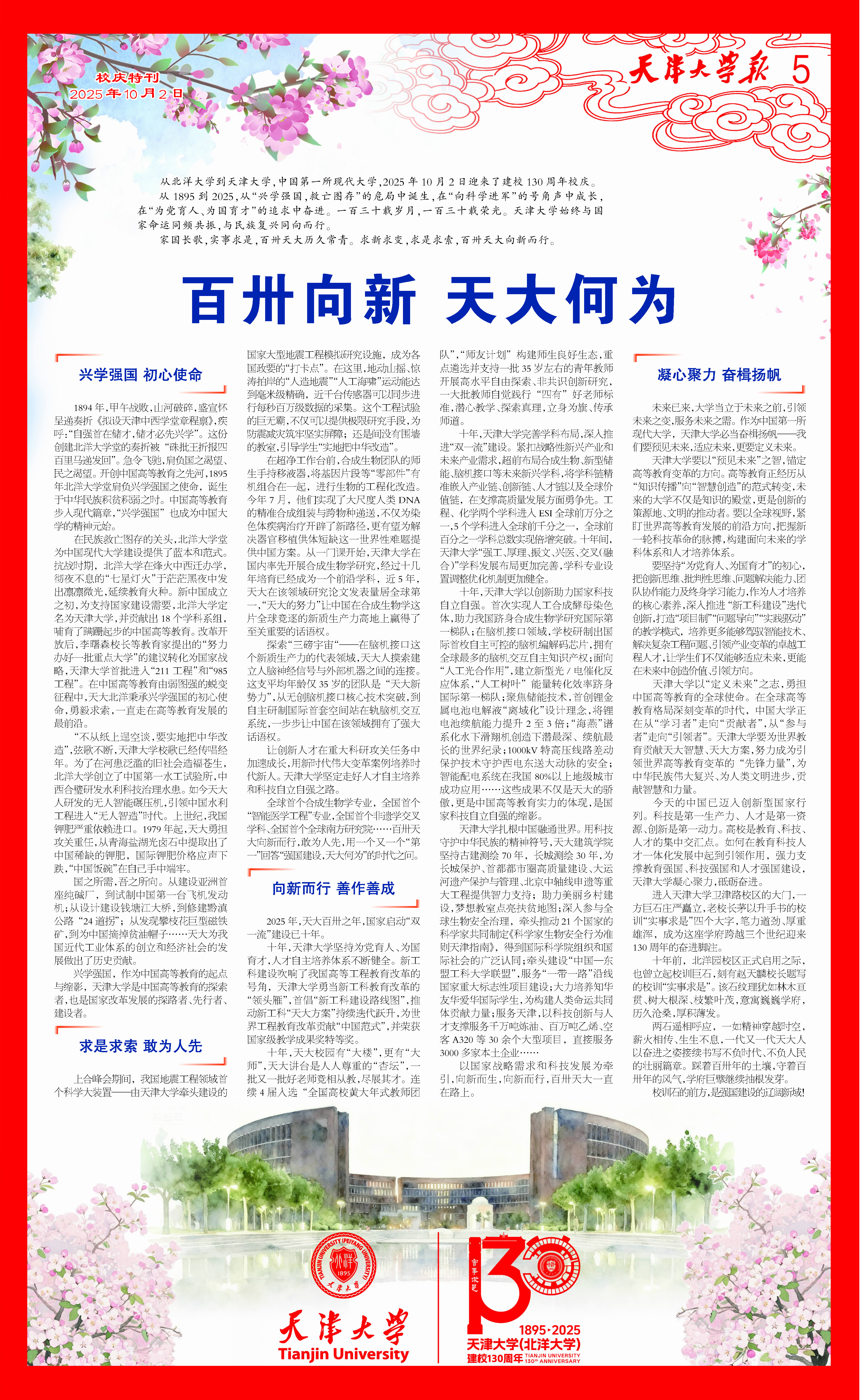 教育是强国建设、民族复兴之基。百卅年前,中国第一所现代大学——北洋大学高举“兴学强国”大旗开中国高等教育之先河;百卅年间,初心不改弦歌浩荡为中华民族作育英才。2025年10月2日,天津大学(北洋大学)将迎来130周年华诞。借此时机,诚邀海内外校友、高等教育和社会各界人士莅临天津大学,共商大学发展之新举措,共绘教育强国之美好蓝图!