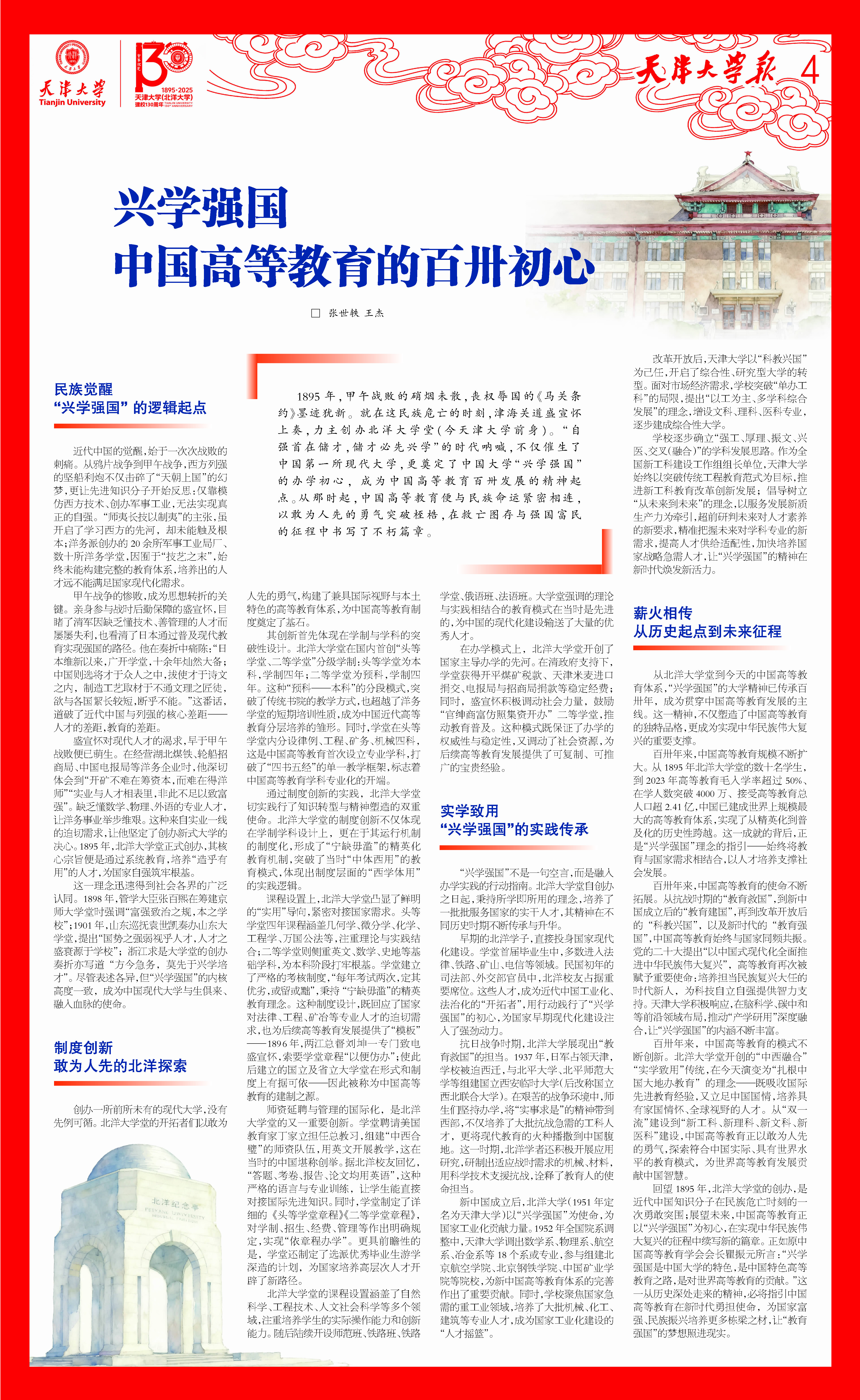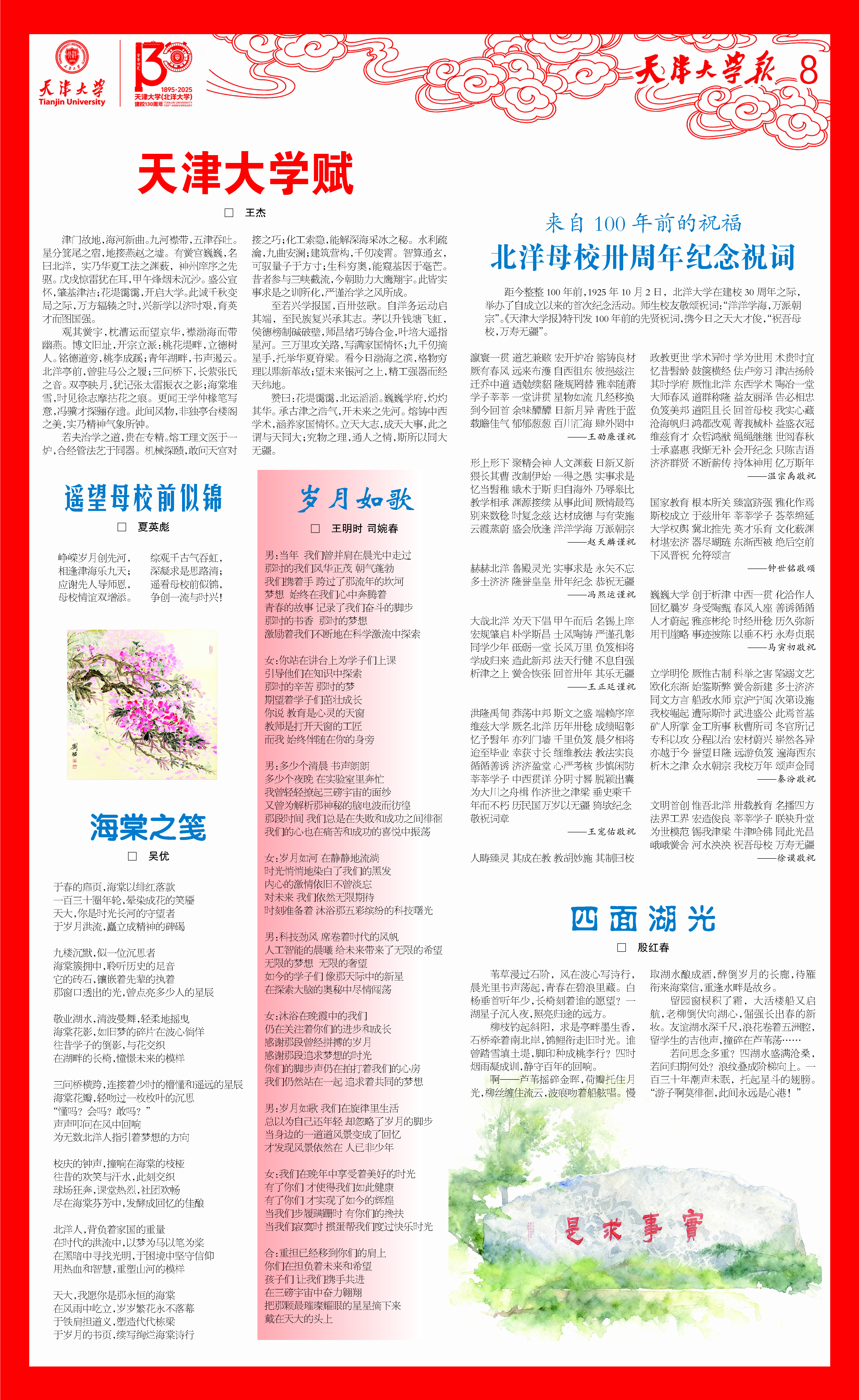 距今整整100年前,1925年10月2日,北洋大学在建校30周年之际,举办了自成立以来的首次纪念活动。师生校友敬颂祝词:“洋洋学海,万派朝宗”。《天津大学报》特刊发100年前的先贤祝词,携今日之天大才俊,“祝吾母校,万寿无疆”。