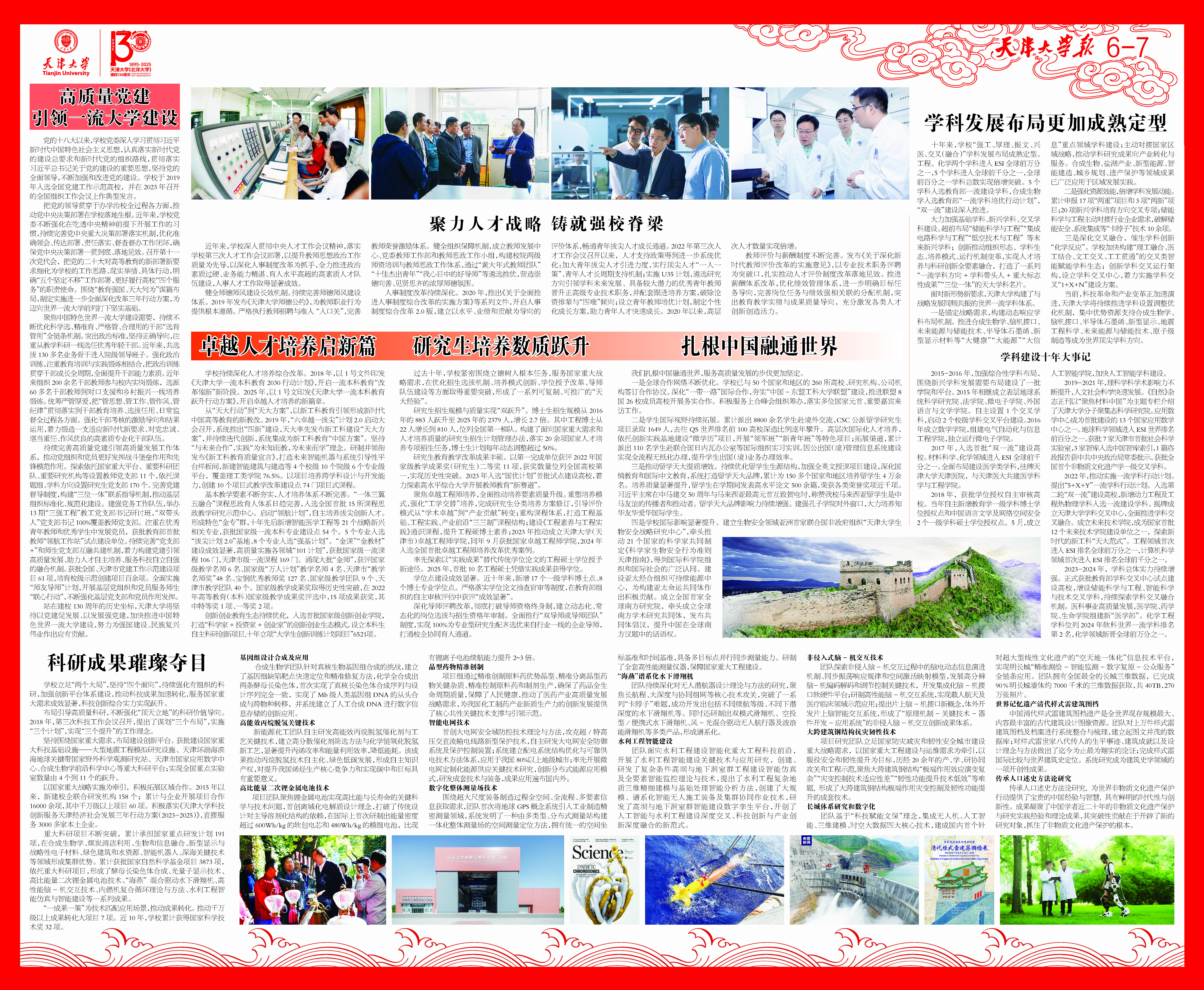 踔厉奋发,再展新猷。新时代新征程,天津大学将始终坚持为党育人、为国育才,统筹教育、科技、人才“三位一体”发展,站在“后天”培养党和国家“明天”需要的栋梁之材,奋力书写教育强国建设的“天大行动”,向着以中国式现代化全面推进强国建设、民族复兴伟业提供有力支撑的目标昂扬奋进、勇毅前行。“望前驱之英华卓荦,应后起之努力追踪”,天大人将坚守“天大品格”,接续奋斗、敢为人先,为以中国式现代化全面推进强国建设、民族复兴伟业贡献天大力量。